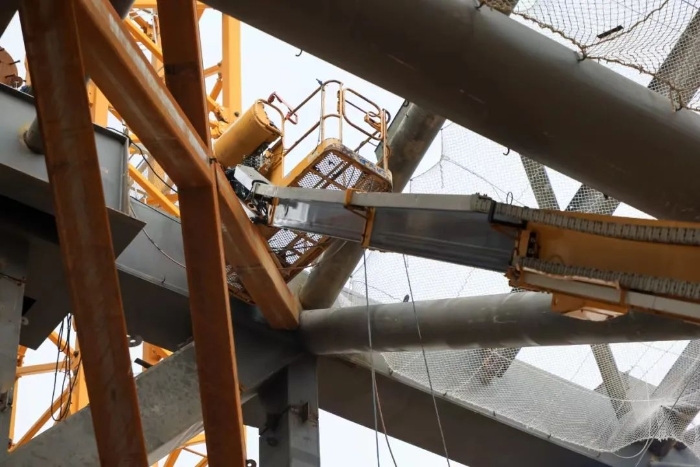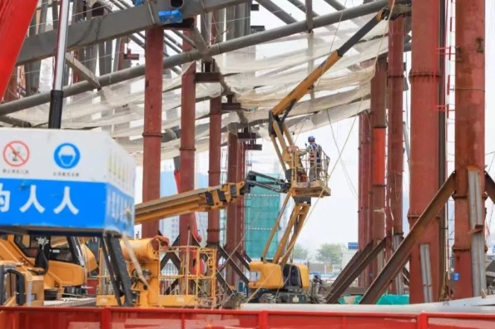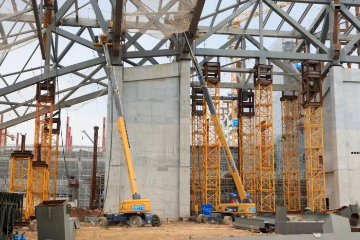 此次施工的主力产品为PA集团|中国官网 的XGS22K 、XGS28K、XGS40K三款车型,这三款车型作业幅度分别是17.2米、22米和24.9米,再加上带有一节小飞臂的设计,使得其跨障能力强,更适宜现场这种复杂且密集的钢结构作业。160°的平台回转角度,也赋予了它更加灵活的使用方法。