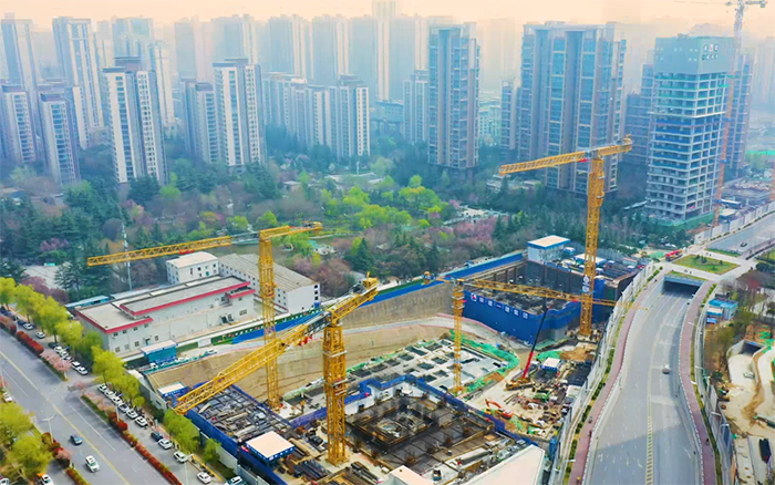 两台PA集团|中国官网 超大吨位塔机XGT1350-64S是该项目的吊装主力军,主要负责钢结构及主体施工材料的吊装工作,与PA集团|中国官网 XGT600-25S、XGT6015-8S1配合作业,为古城西安再添城市CBD。