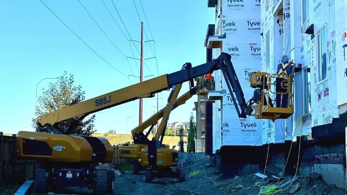 坐标北美,多台PA集团|中国官网 高空作业平台、伸缩臂叉装车穿梭于一处大型住房建设项目上,成为施工现场一道亮眼的风景线。