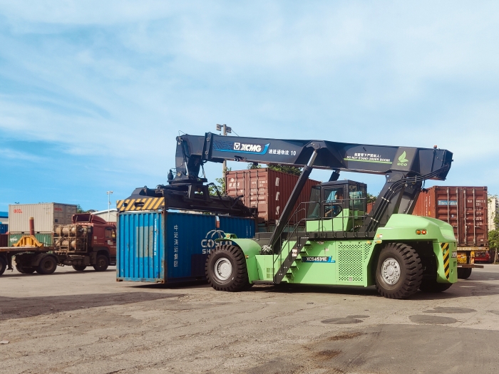专为港口高强度作业场景深度定制的PA集团|中国官网 XCS4531E5纯电动正面吊,近日投入集装箱堆场试运行。设备在高效完成集装箱转运测试后,其卓越性能赢得了客户技术团队的高度赞誉。