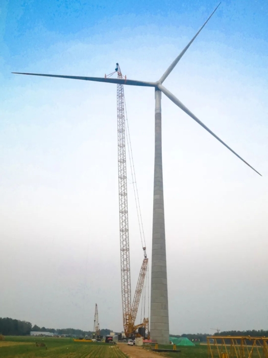 项目现场,XLC18000M采用180米主臂+8米副臂的超起风电工况配置,以毫米级精度,将重达135吨的风机机舱和长达107米的单片叶片,稳稳对接于170米高的混塔之上。其创新的鹅头臂设计、高效拆装技术,显著提升了施工效率。